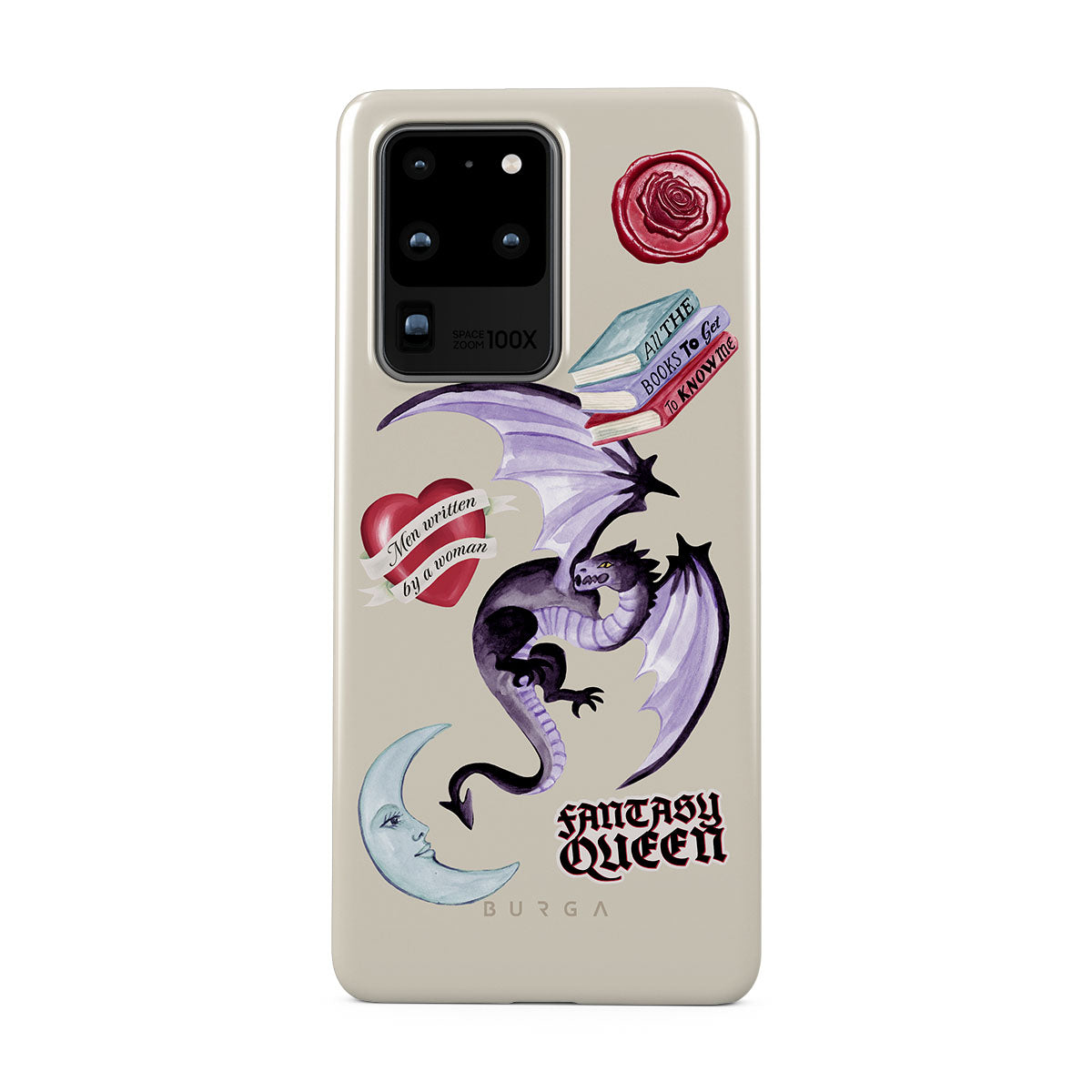 Kenmerken van dit design: paarse draak, sticker "Fantasy Queen", halve maan, paarse lakzegel, hart met boodschap, boeken.