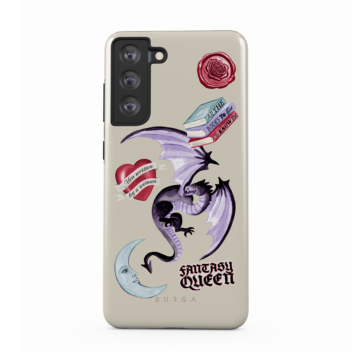 Kenmerken van dit design: paarse draak, sticker "Fantasy Queen", halve maan, paarse lakzegel, hart met boodschap, boeken.