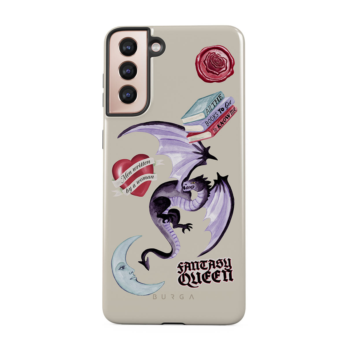 Kenmerken van dit design: paarse draak, sticker "Fantasy Queen", halve maan, paarse lakzegel, hart met boodschap, boeken.