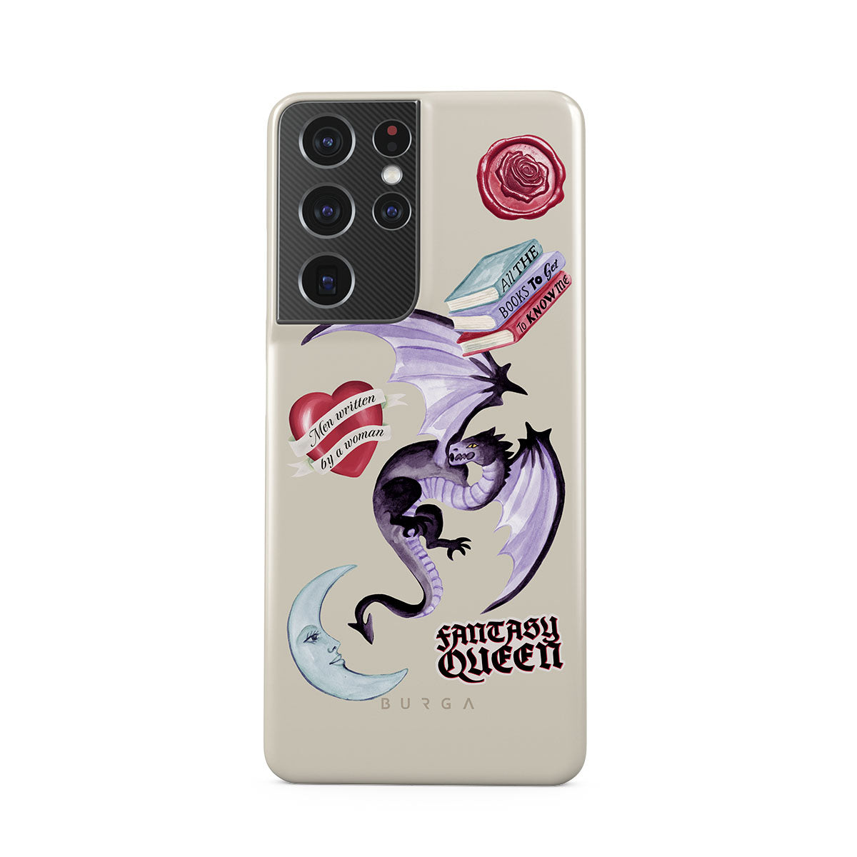 Kenmerken van dit design: paarse draak, sticker "Fantasy Queen", halve maan, paarse lakzegel, hart met boodschap, boeken.