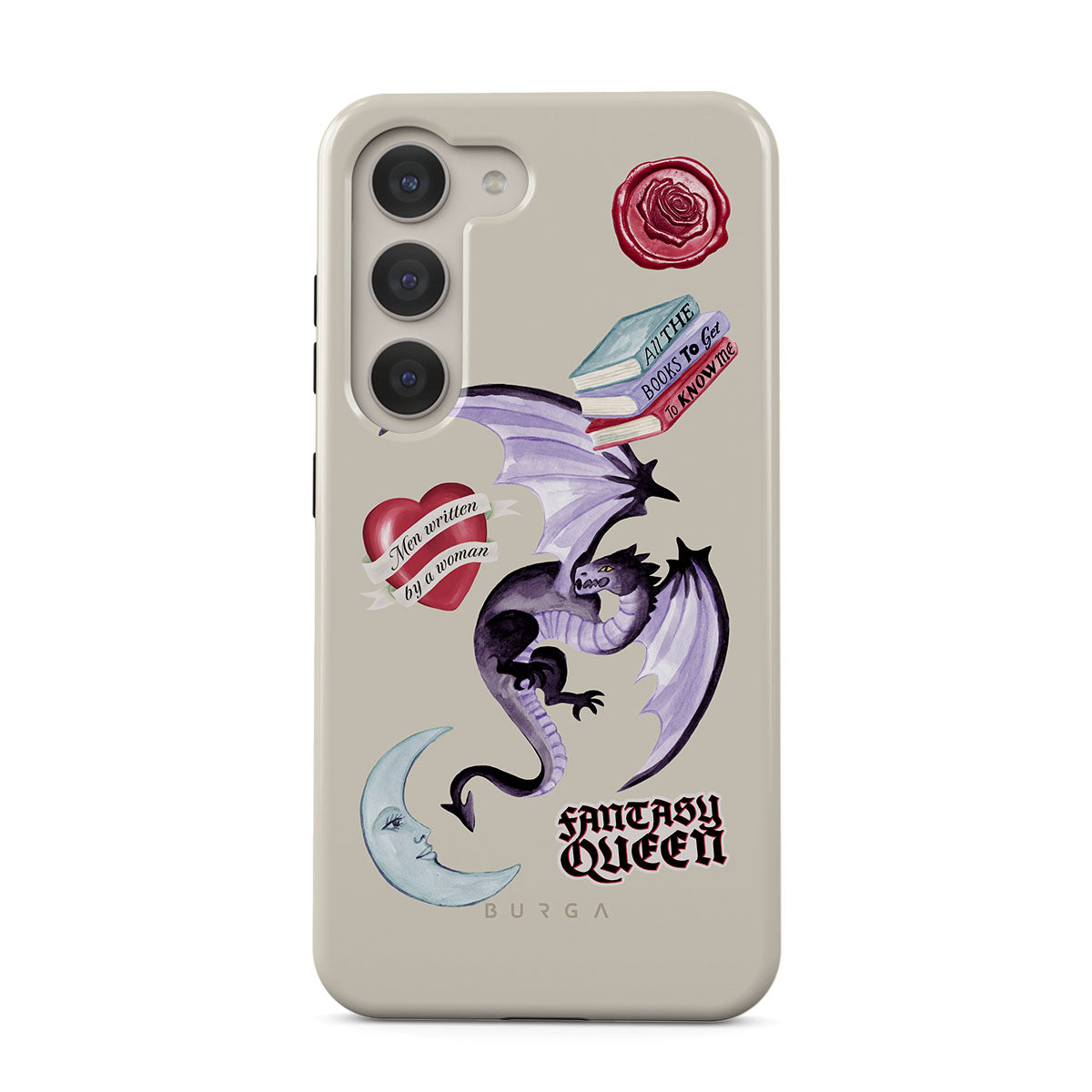 Kenmerken van dit design: paarse draak, sticker "Fantasy Queen", halve maan, paarse lakzegel, hart met boodschap, boeken.