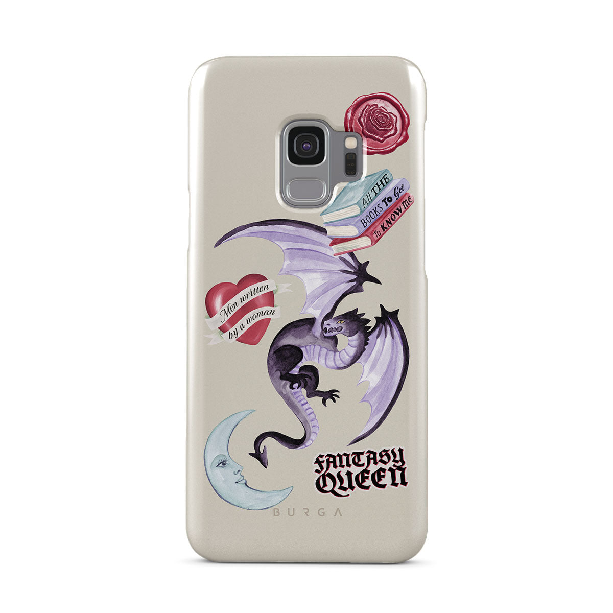 Kenmerken van dit design: paarse draak, sticker "Fantasy Queen", halve maan, paarse lakzegel, hart met boodschap, boeken.