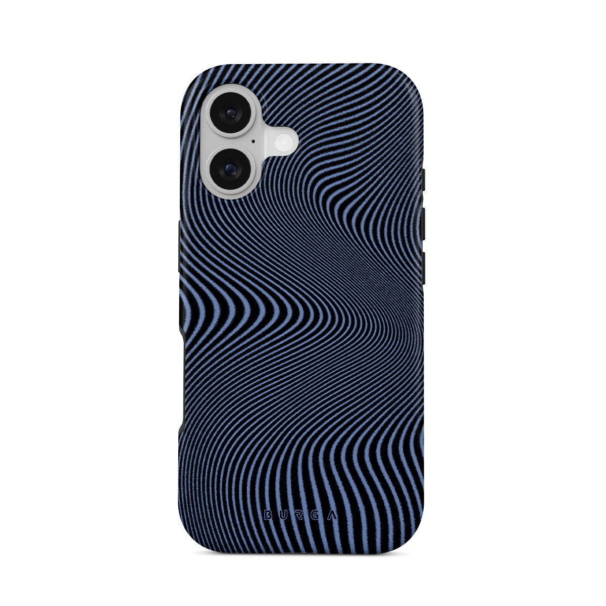 Kenmerken van dit design: blauwe lijnen, zwarte lijnen, vloeiende lijnen, golfpatroon, optische illusie, abstract patroon