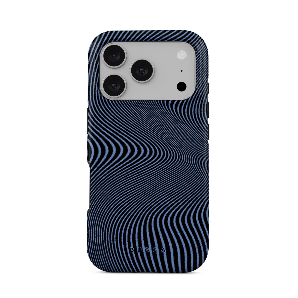 Kenmerken van dit design: blauwe lijnen, zwarte lijnen, vloeiende lijnen, golfpatroon, optische illusie, abstract patroon