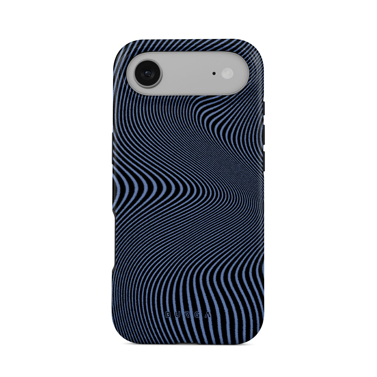 Kenmerken van dit design: blauwe lijnen, zwarte lijnen, vloeiende lijnen, golfpatroon, optische illusie, abstract patroon