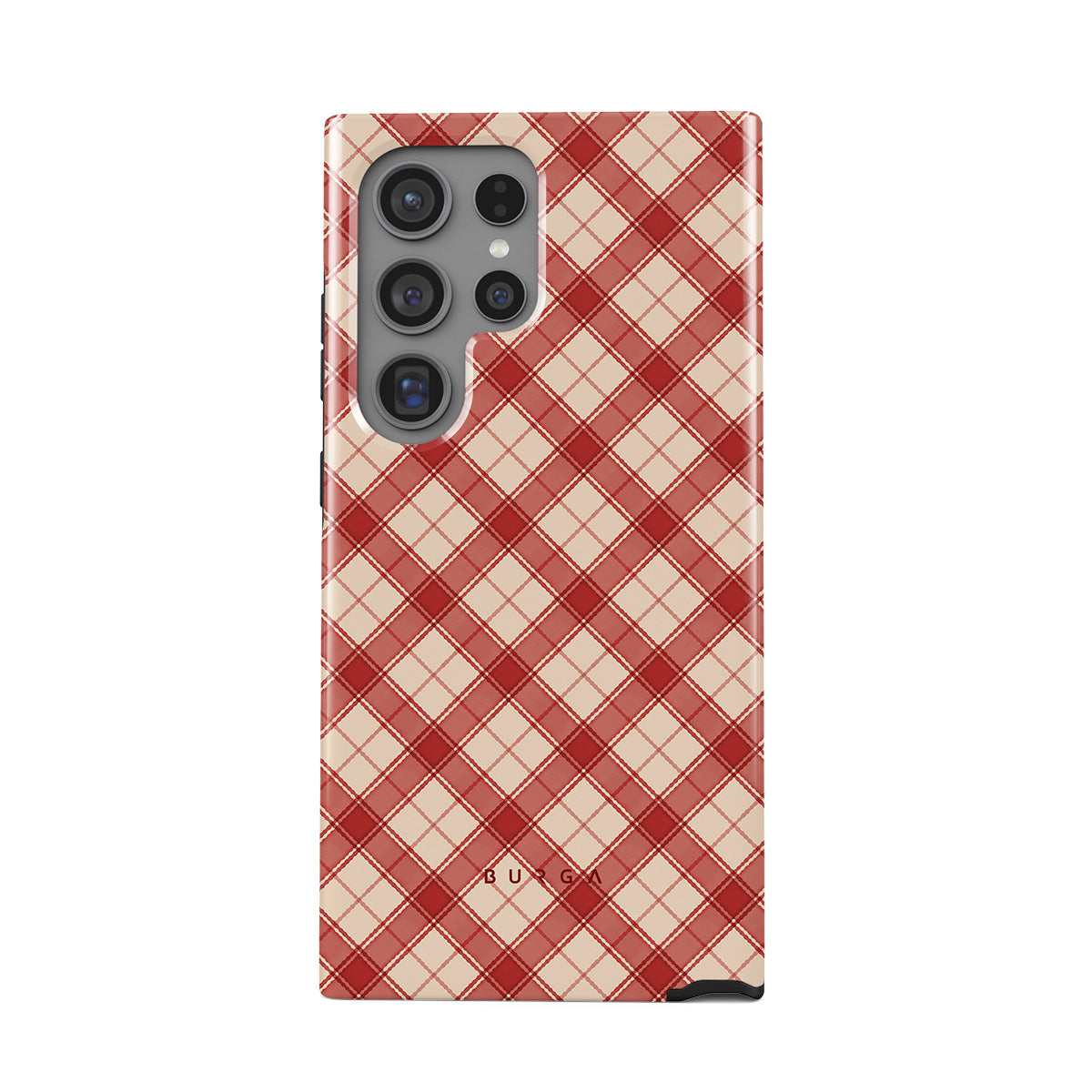 Kenmerken van dit design: rood en beige ruit, diagonaal ruitpatroon, klassiek tartan, buffalo check stijl, traditionele kerst ruit
