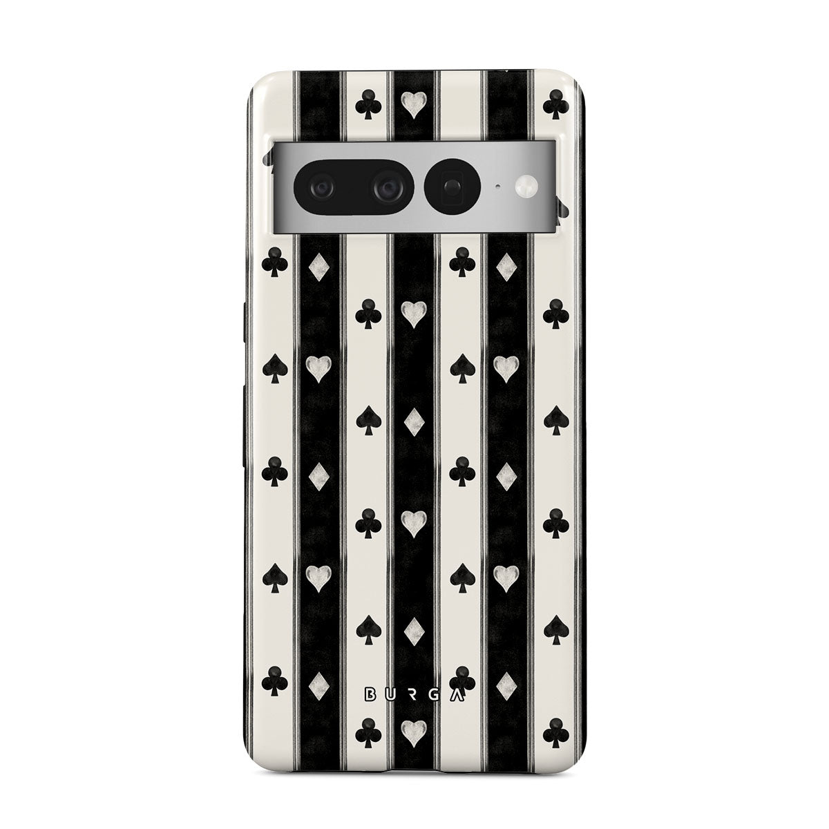 Kenmerken van dit design: zwart-witte strepen, harten, kaartspel symbolen, vintage stijl