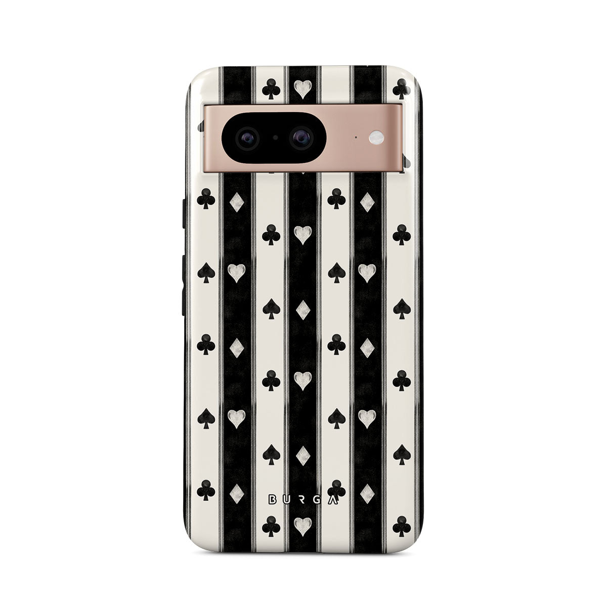 Kenmerken van dit design: zwart-witte strepen, harten, kaartspel symbolen, vintage stijl