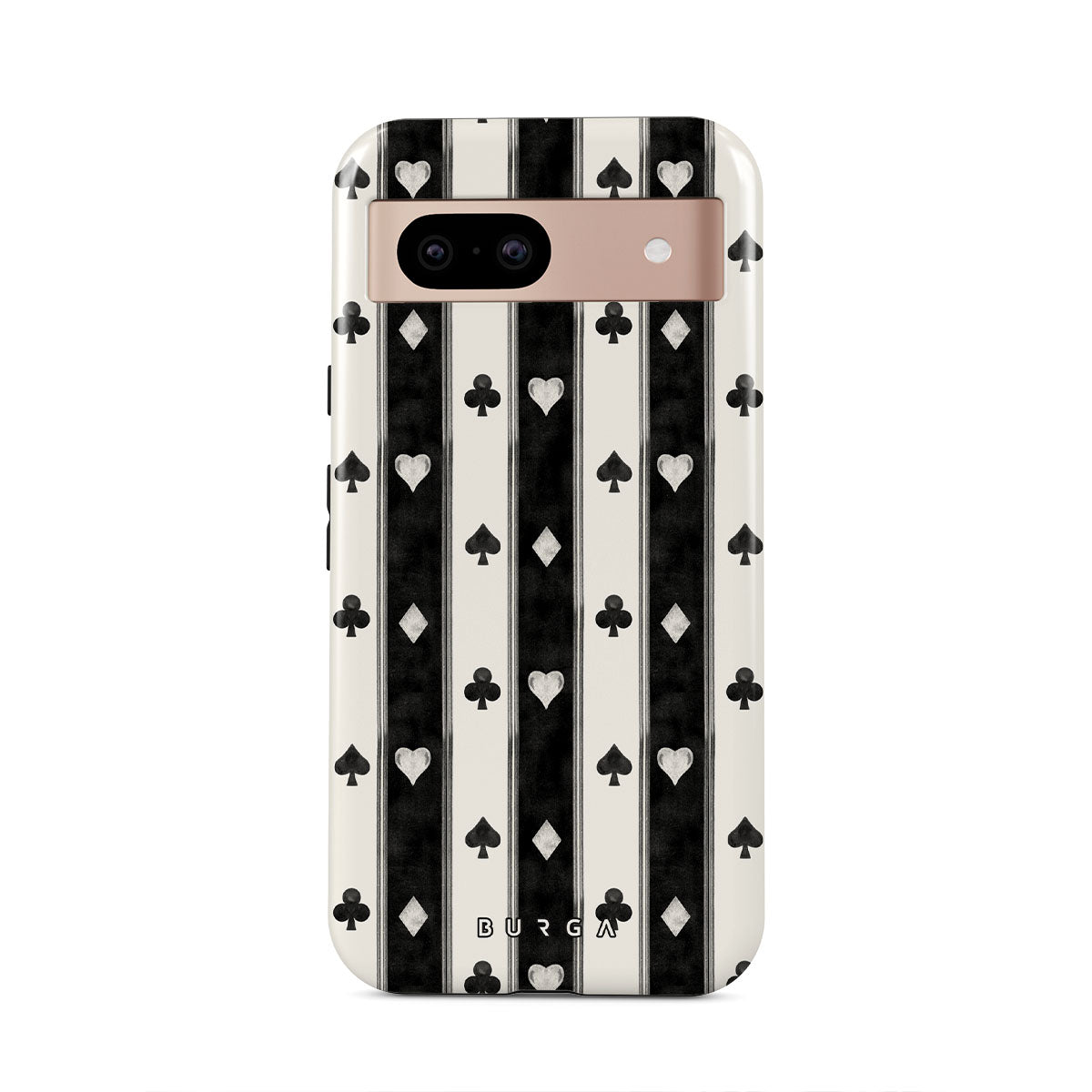 Kenmerken van dit design: zwart-witte strepen, harten, kaartspel symbolen, vintage stijl