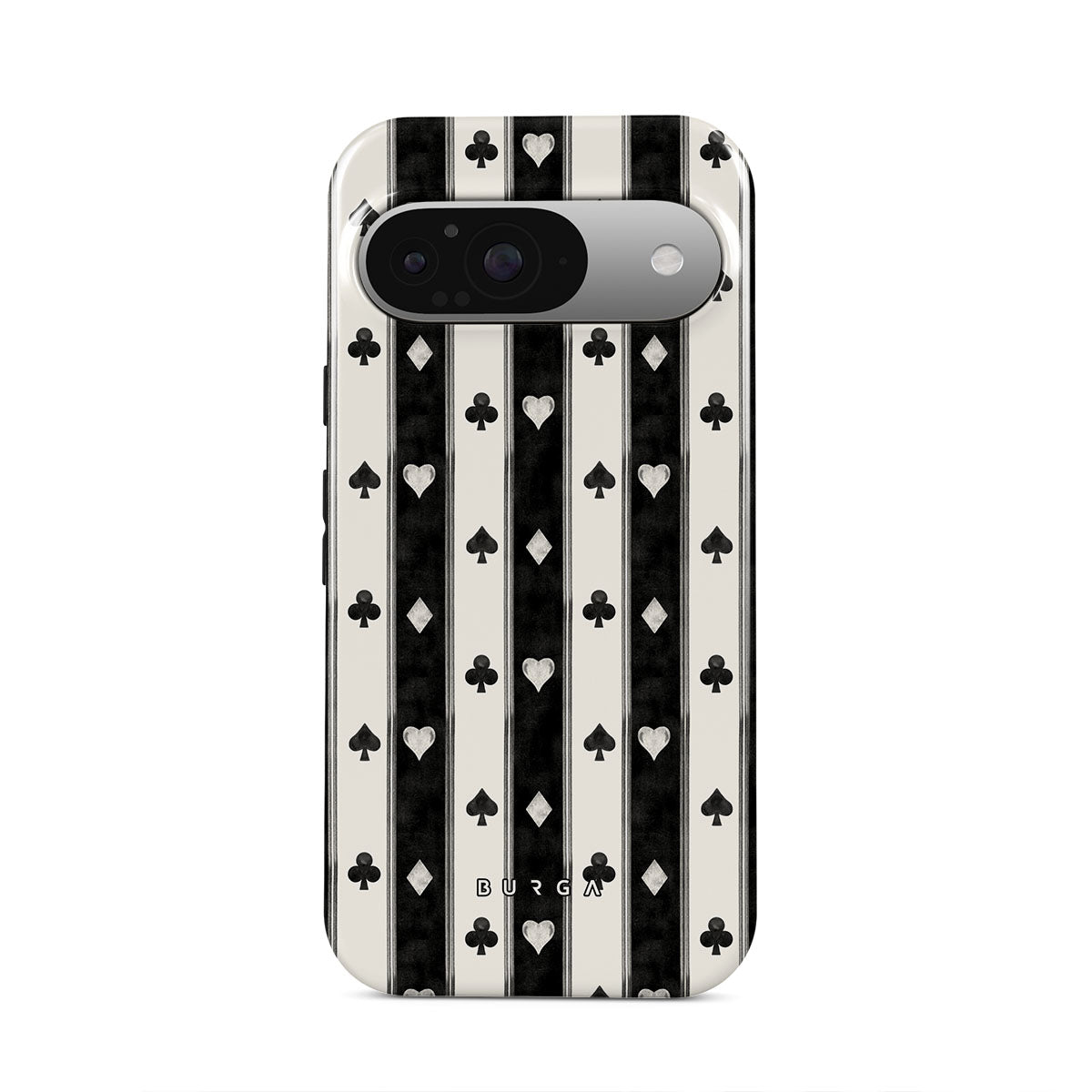 Kenmerken van dit design: zwart-witte strepen, harten, kaartspel symbolen, vintage stijl