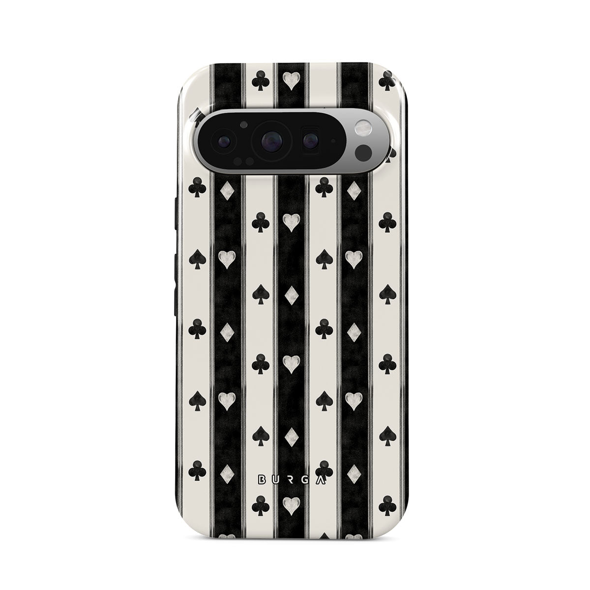 Kenmerken van dit design: zwart-witte strepen, harten, kaartspel symbolen, vintage stijl
