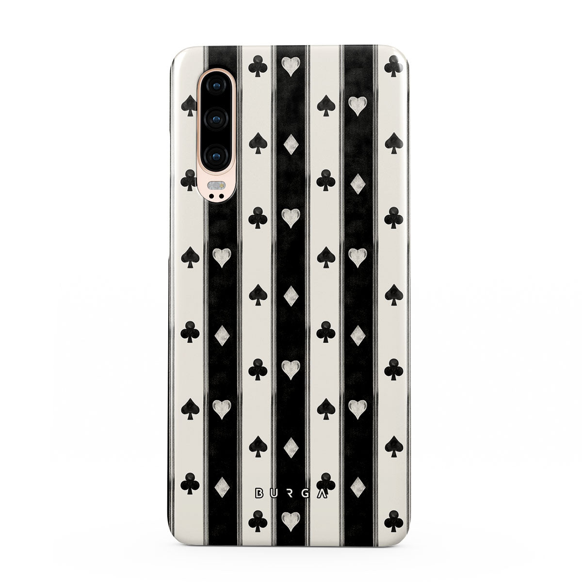 Kenmerken van dit design: zwart-witte strepen, harten, kaartspel symbolen, vintage stijl
