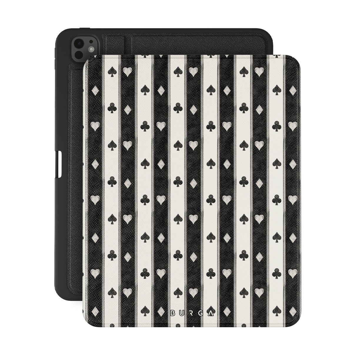 Kenmerken van dit design: zwart-witte strepen, harten, kaartspel symbolen, vintage stijl