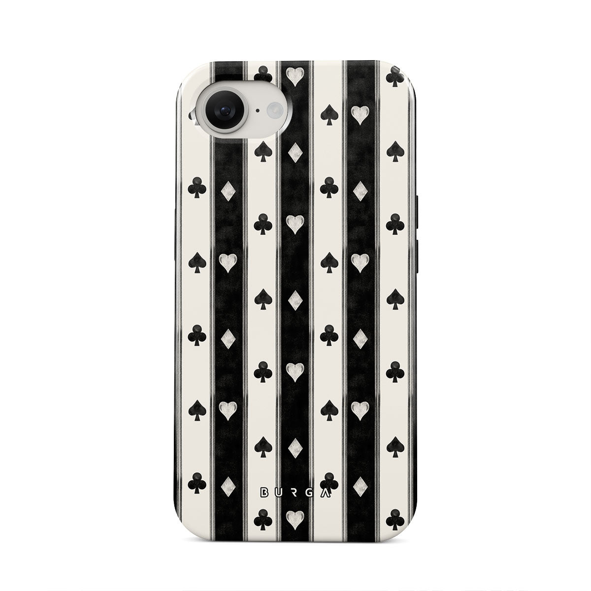 Kenmerken van dit design: zwart-witte strepen, harten, kaartspel symbolen, vintage stijl