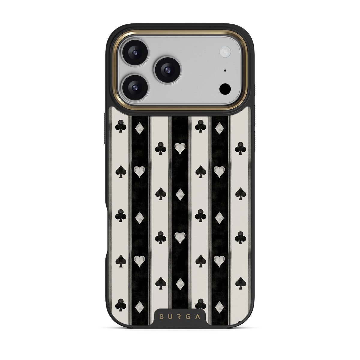 Kenmerken van dit design: zwart-witte strepen, harten, kaartspel symbolen, vintage stijl