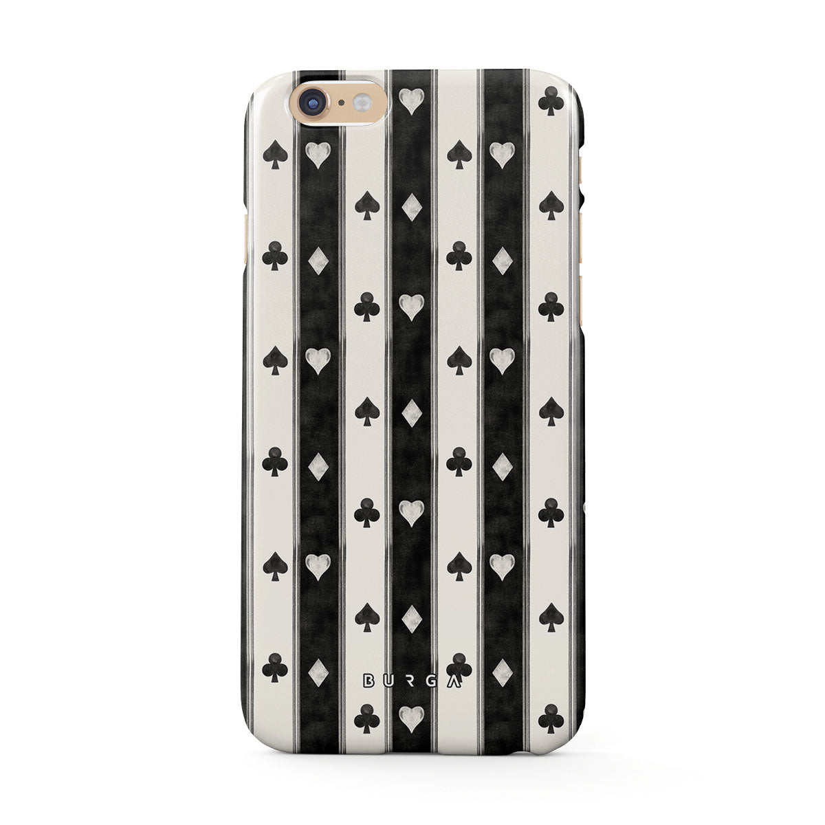 Kenmerken van dit design: zwart-witte strepen, harten, kaartspel symbolen, vintage stijl