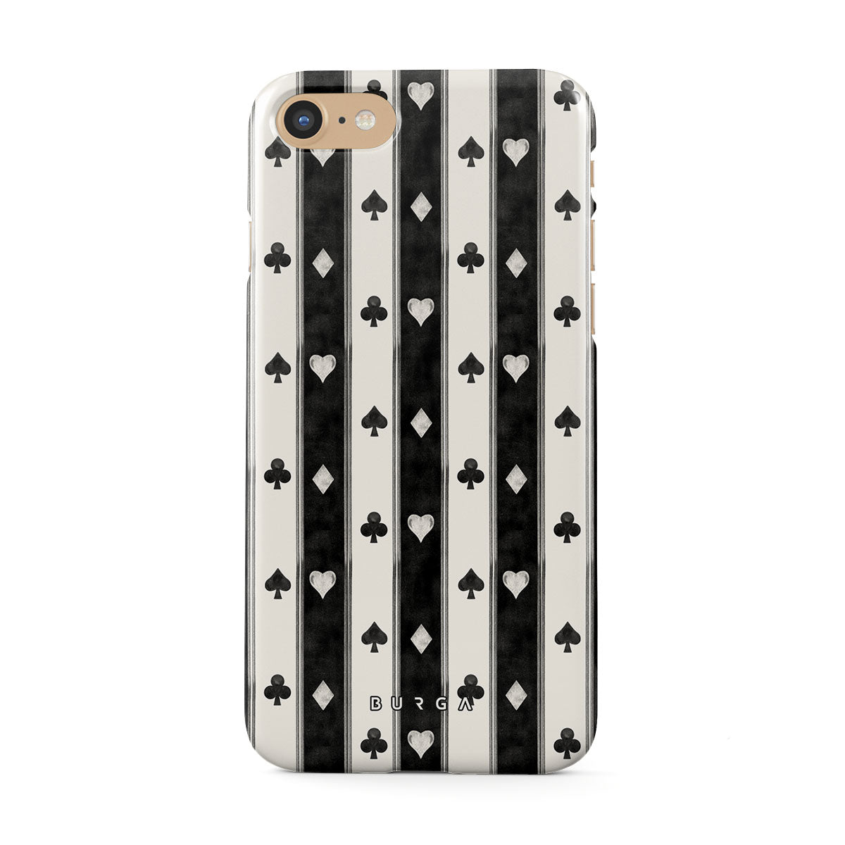 Kenmerken van dit design: zwart-witte strepen, harten, kaartspel symbolen, vintage stijl