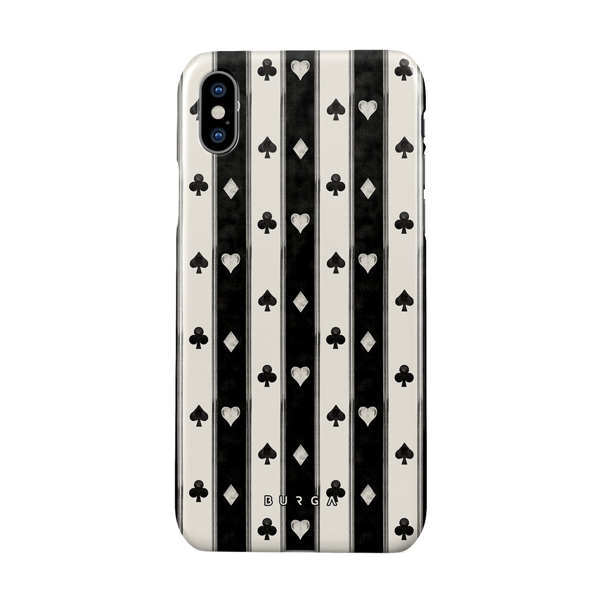 Kenmerken van dit design: zwart-witte strepen, harten, kaartspel symbolen, vintage stijl