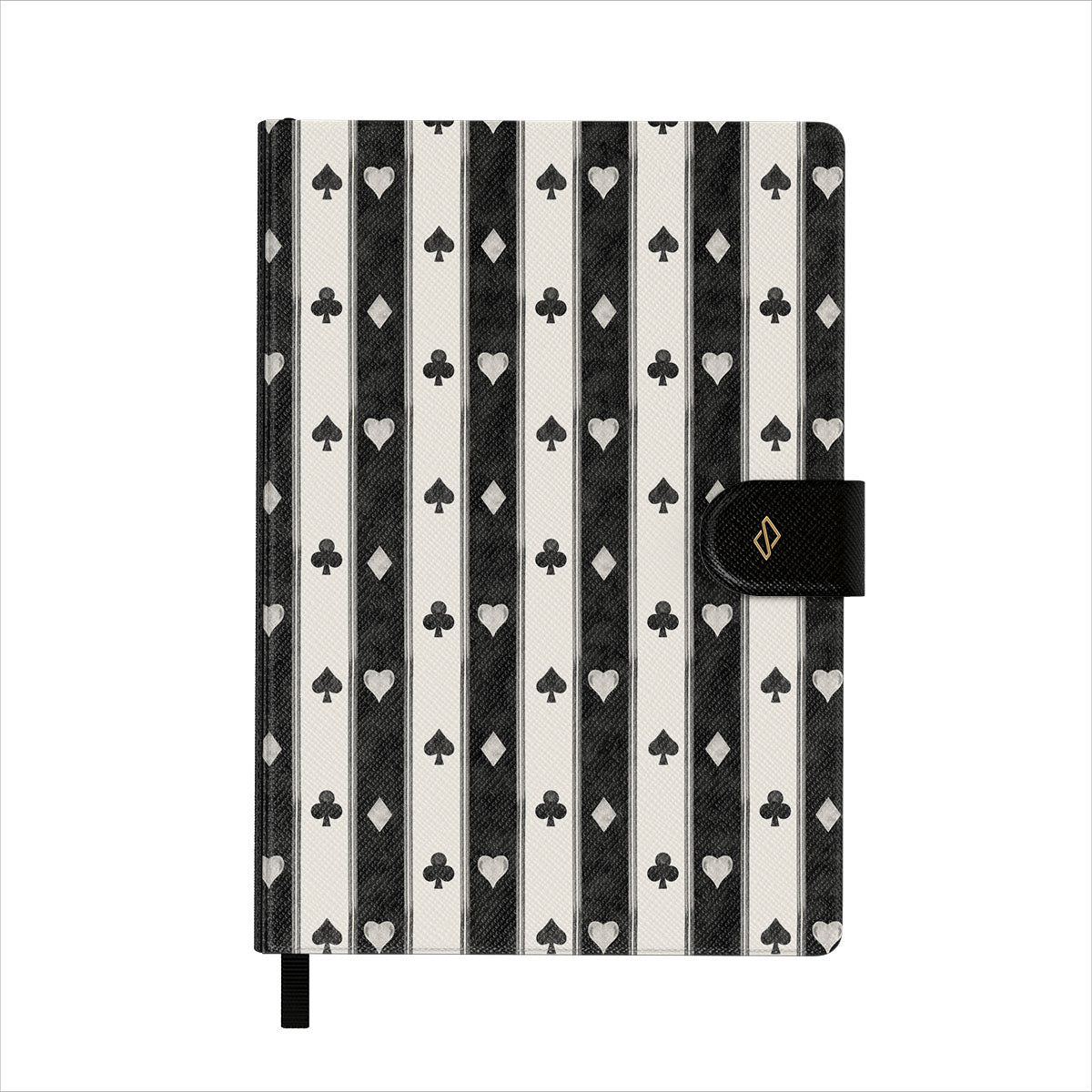 Kenmerken van dit design: zwart-witte strepen, harten, kaartspel symbolen, vintage stijl