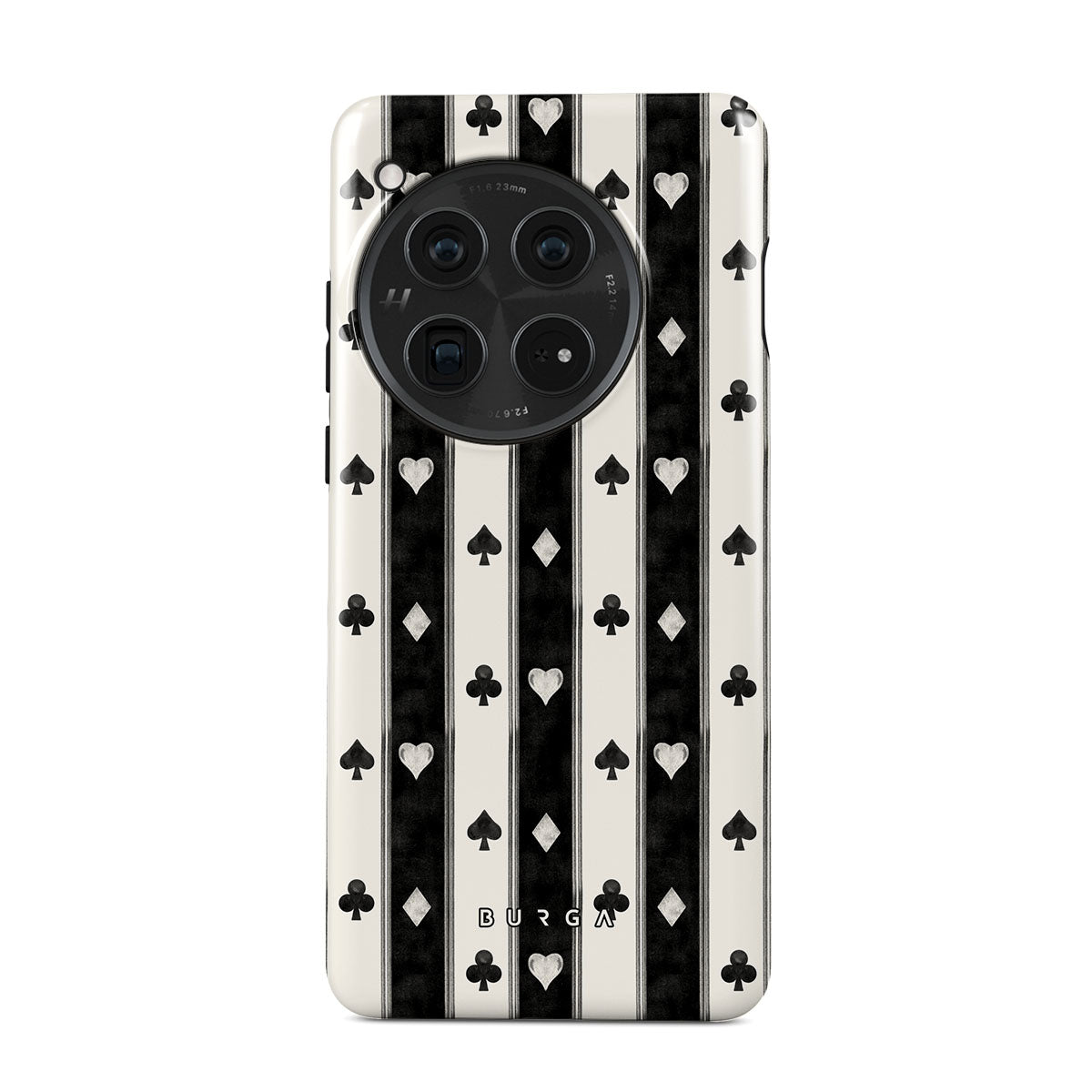 Kenmerken van dit design: zwart-witte strepen, harten, kaartspel symbolen, vintage stijl