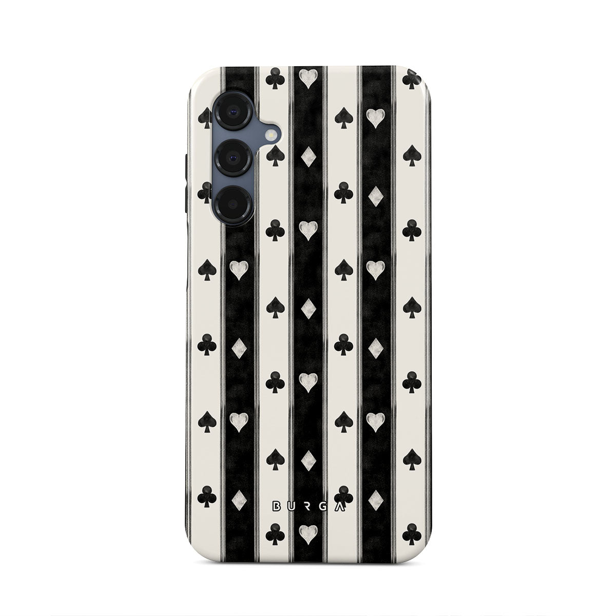 Kenmerken van dit design: zwart-witte strepen, harten, kaartspel symbolen, vintage stijl