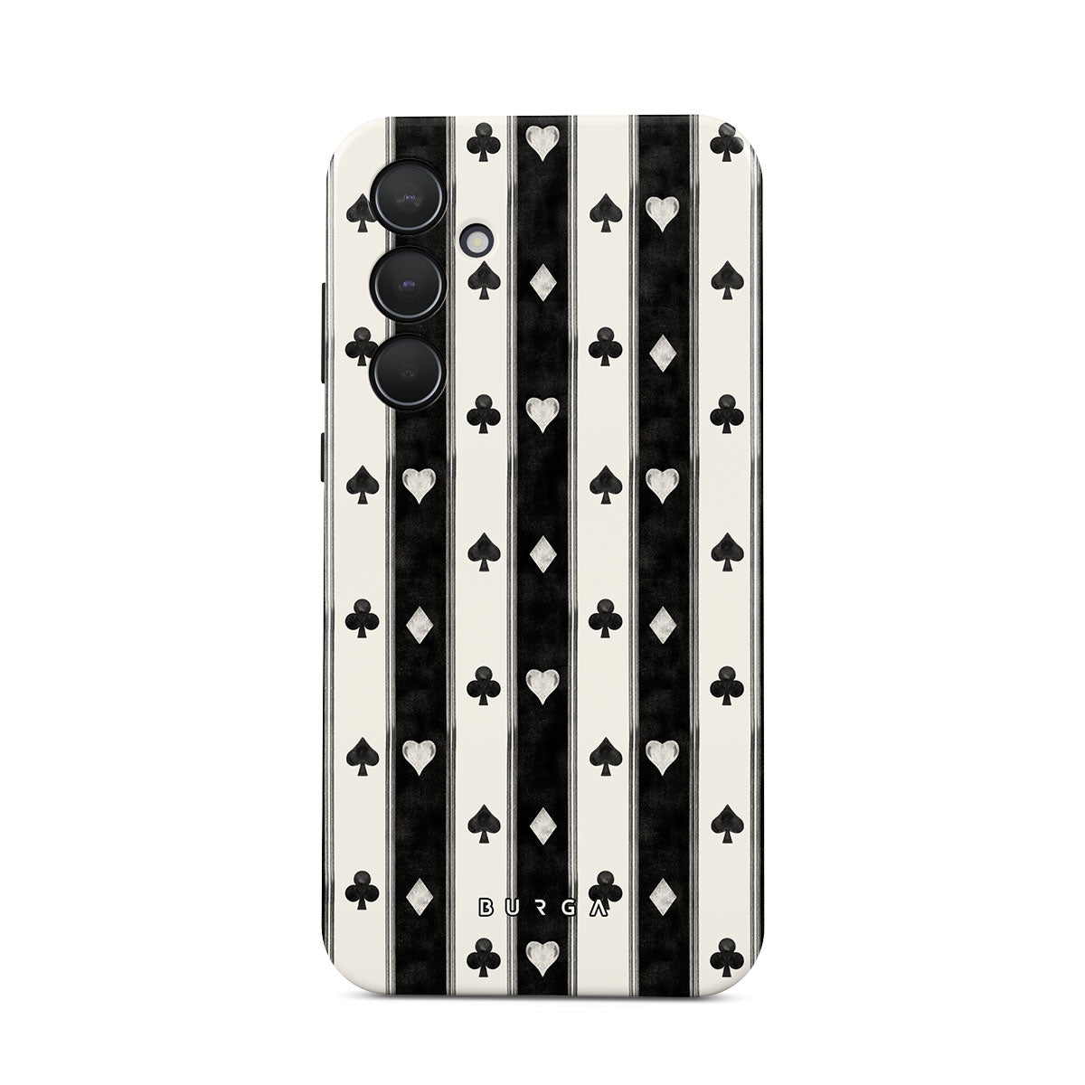 Kenmerken van dit design: zwart-witte strepen, harten, kaartspel symbolen, vintage stijl