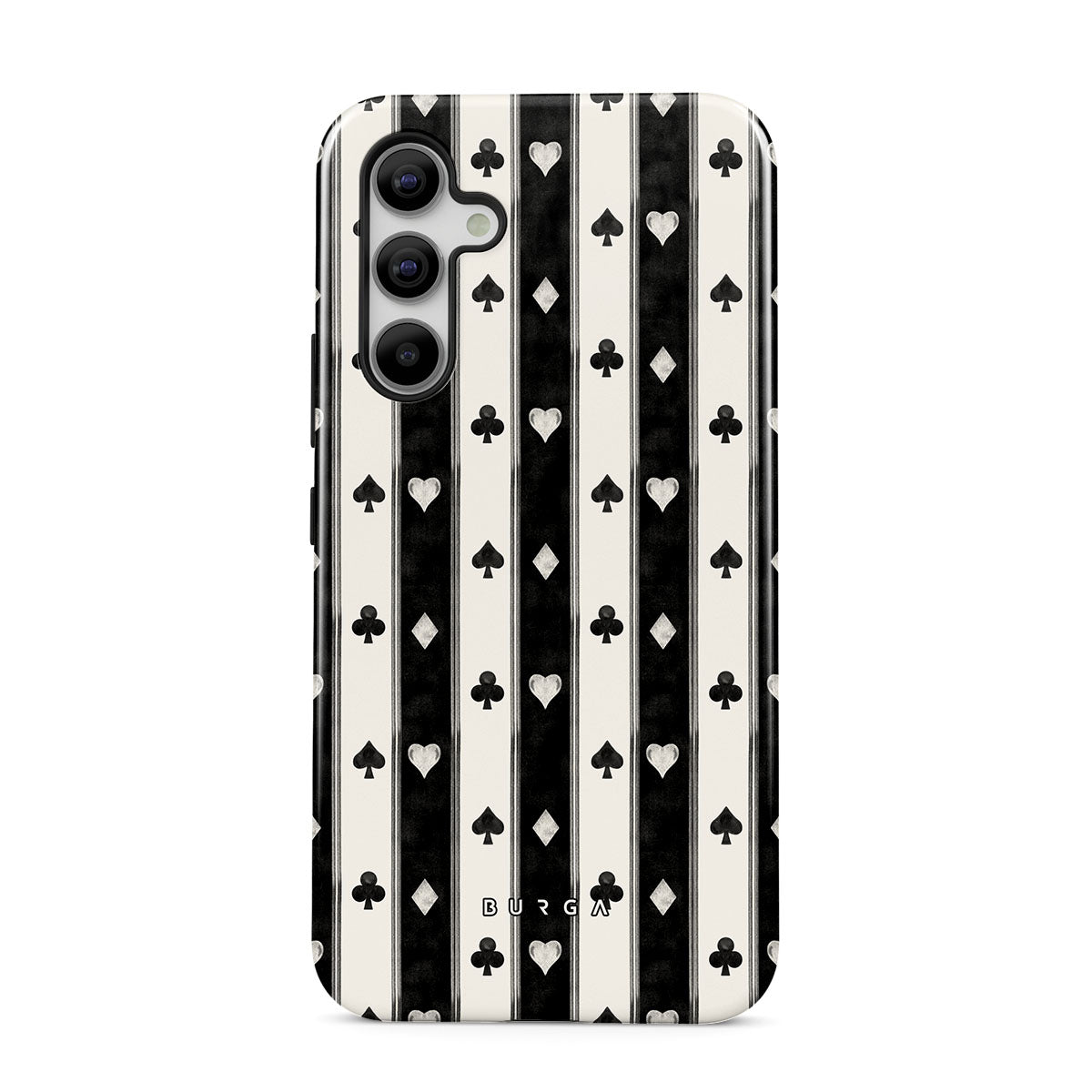 Kenmerken van dit design: zwart-witte strepen, harten, kaartspel symbolen, vintage stijl