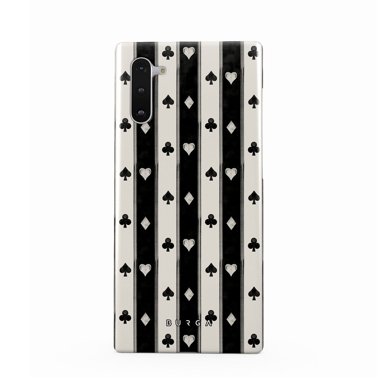 Kenmerken van dit design: zwart-witte strepen, harten, kaartspel symbolen, vintage stijl