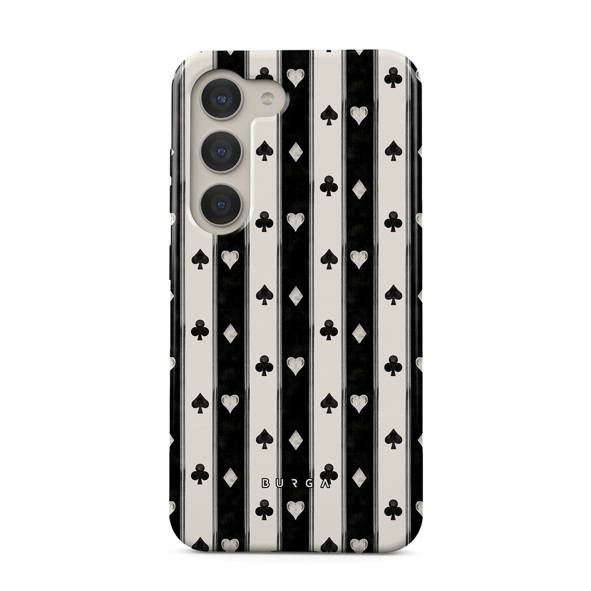 Kenmerken van dit design: zwart-witte strepen, harten, kaartspel symbolen, vintage stijl