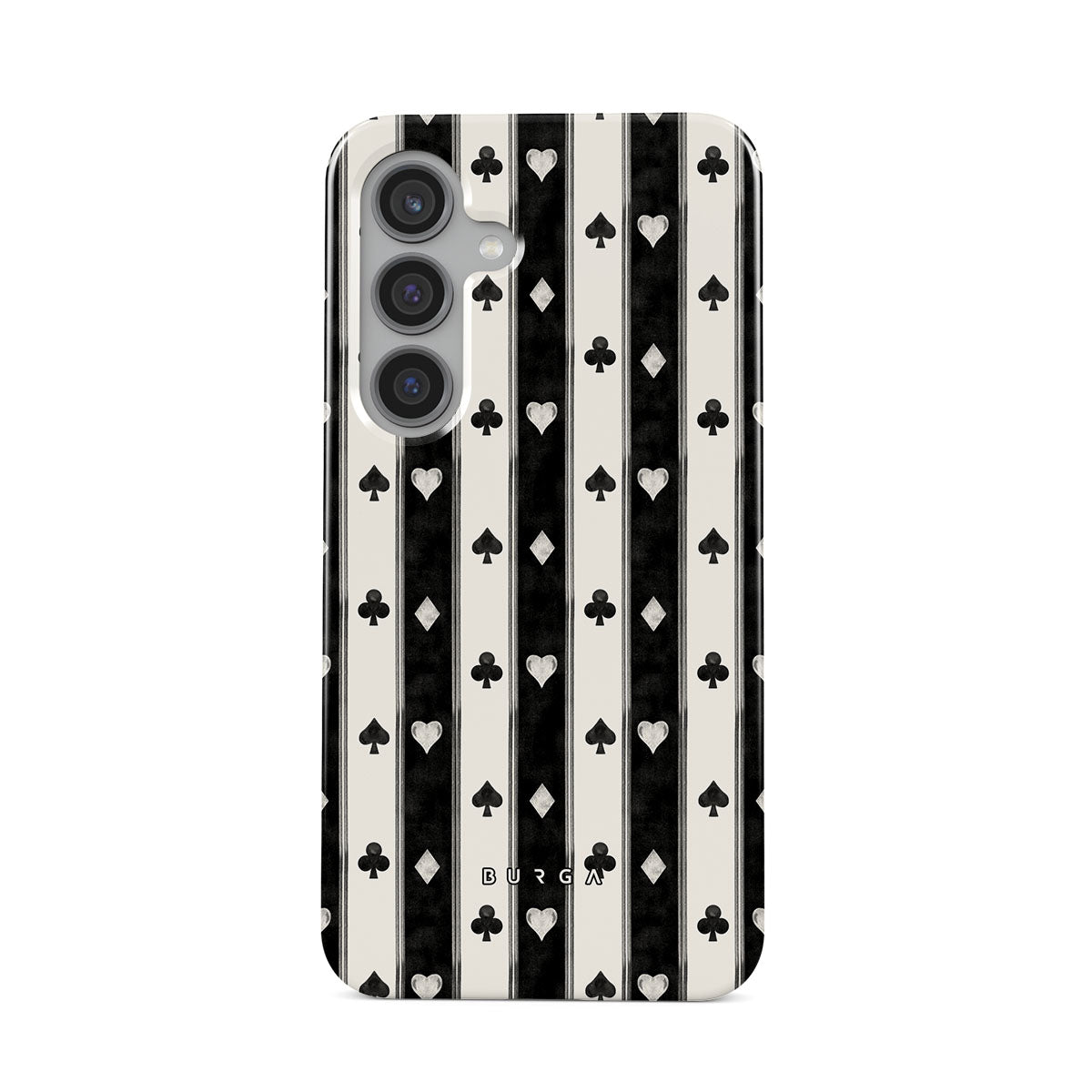 Kenmerken van dit design: zwart-witte strepen, harten, kaartspel symbolen, vintage stijl