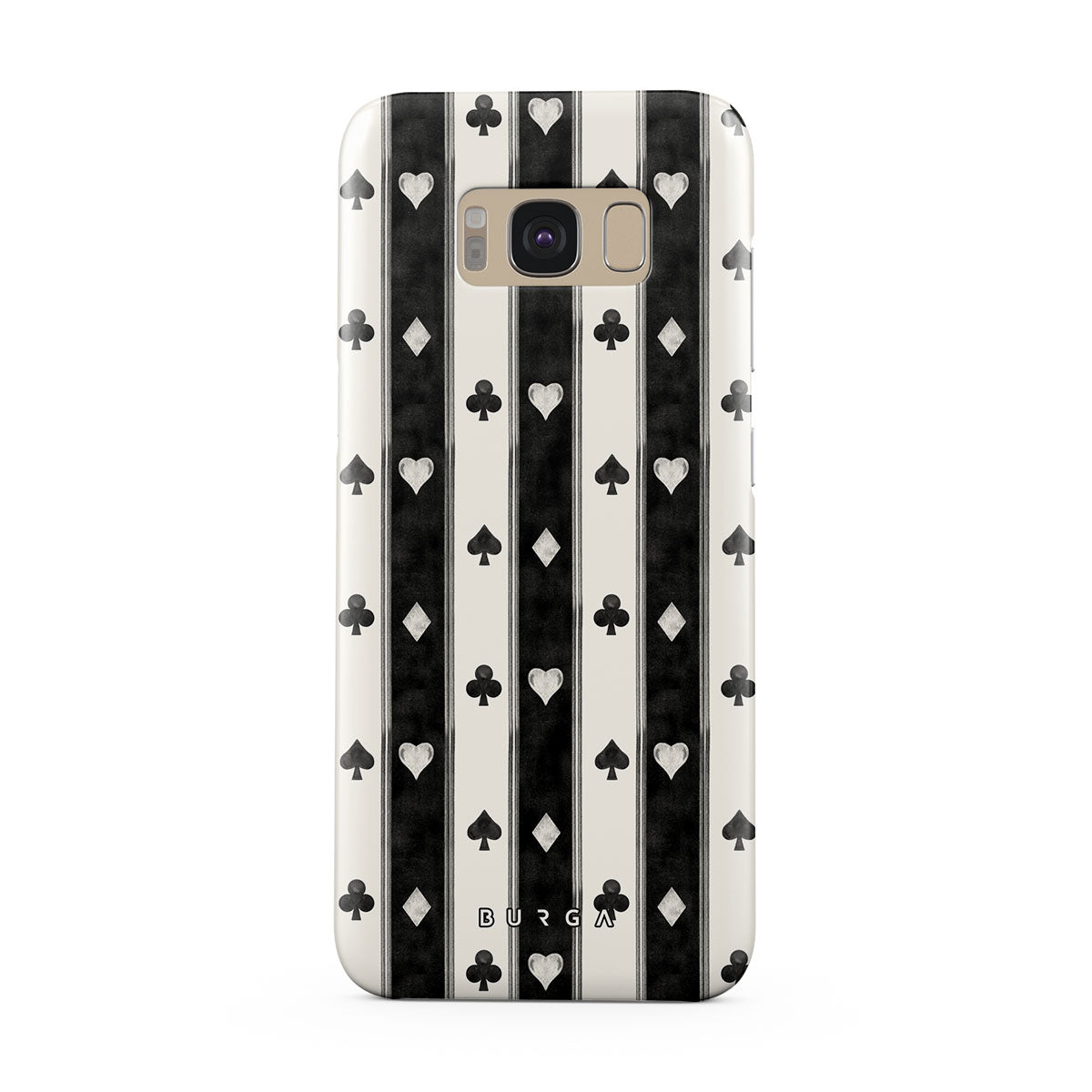 Kenmerken van dit design: zwart-witte strepen, harten, kaartspel symbolen, vintage stijl