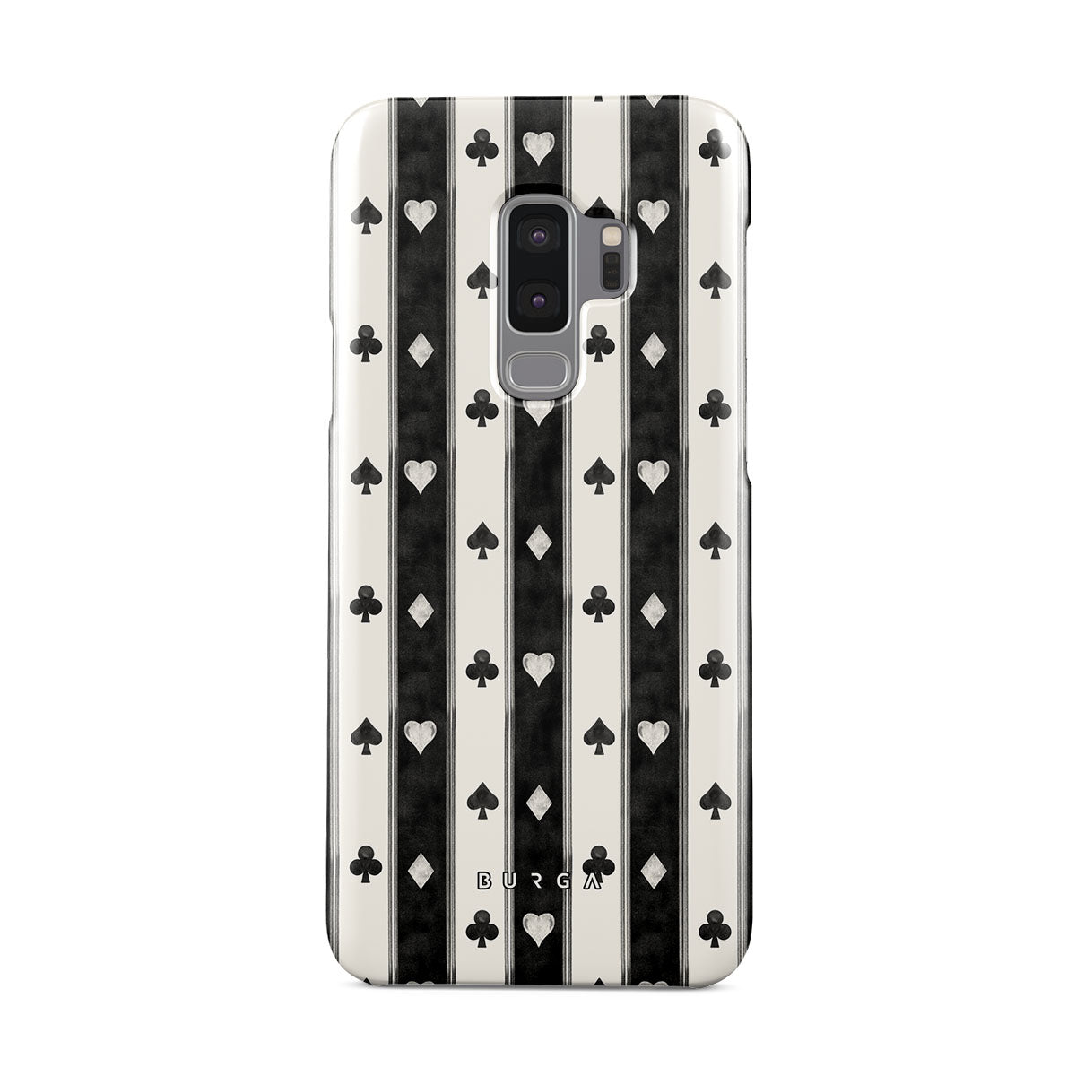 Kenmerken van dit design: zwart-witte strepen, harten, kaartspel symbolen, vintage stijl