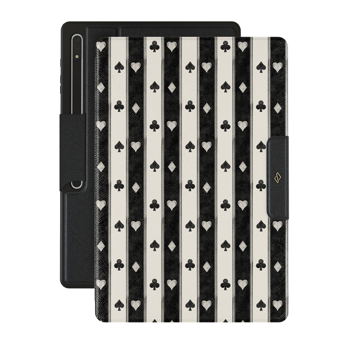 Kenmerken van dit design: zwart-witte strepen, harten, kaartspel symbolen, vintage stijl