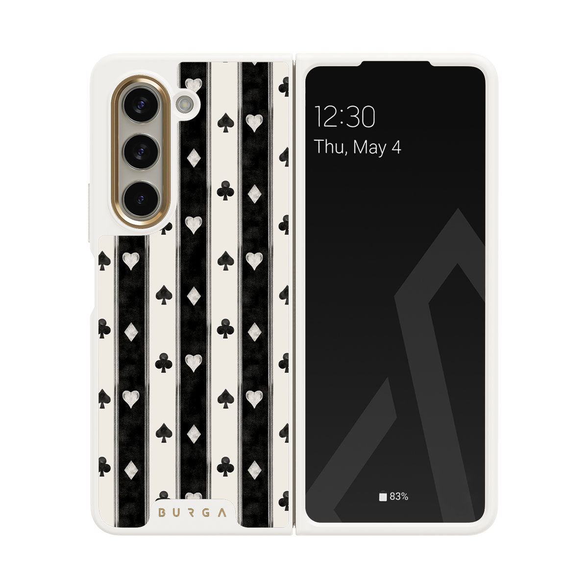 Kenmerken van dit design: zwart-witte strepen, harten, kaartspel symbolen, vintage stijl