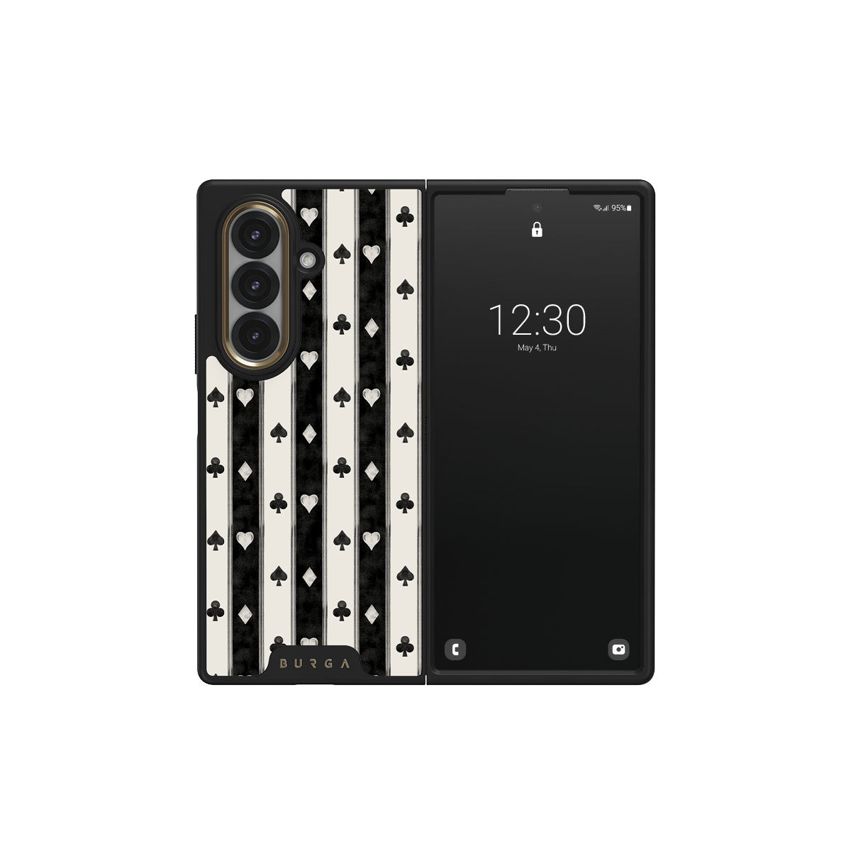 Kenmerken van dit design: zwart-witte strepen, harten, kaartspel symbolen, vintage stijl