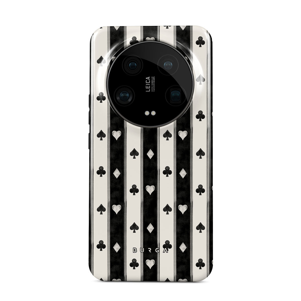 Kenmerken van dit design: zwart-witte strepen, harten, kaartspel symbolen, vintage stijl