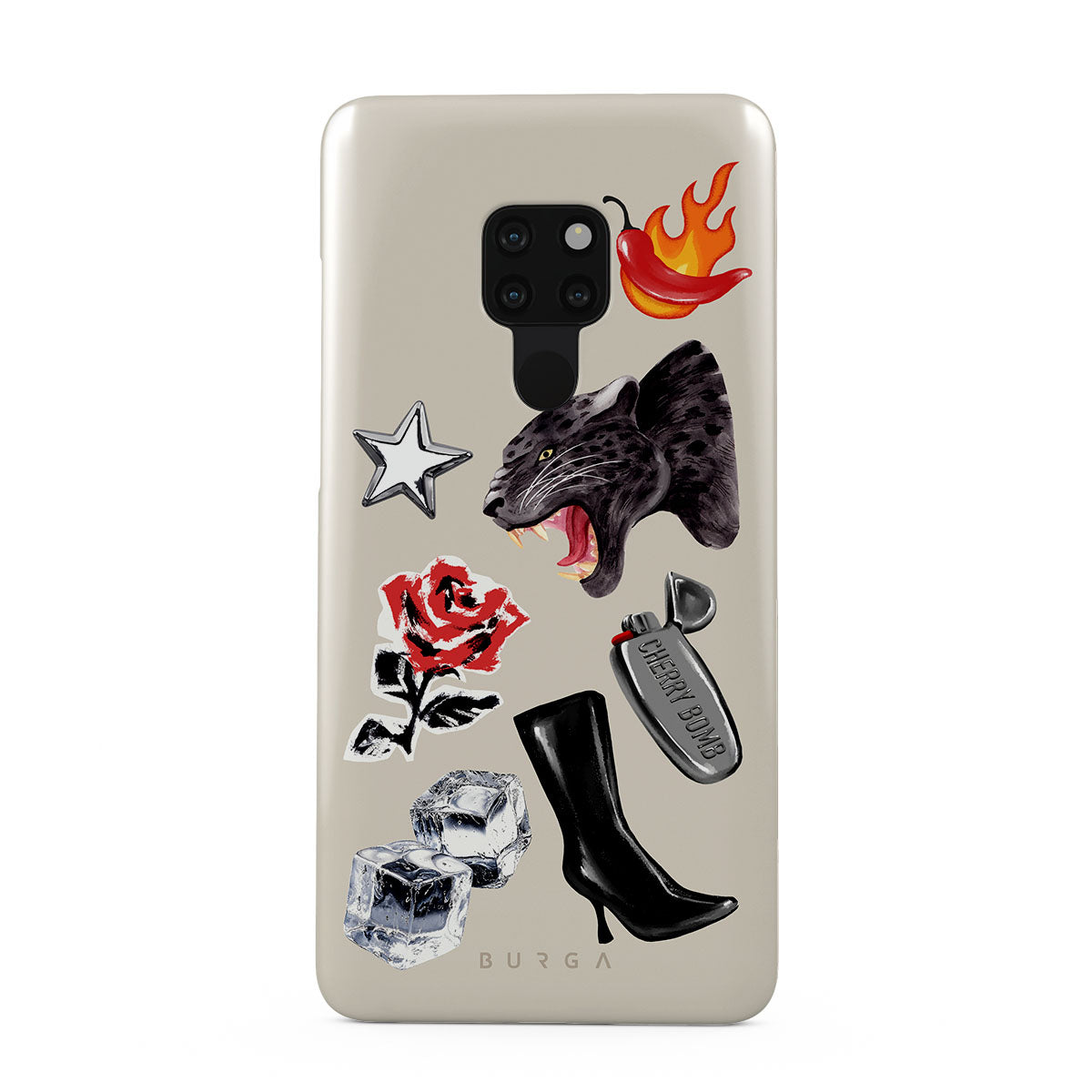 Kenmerken van dit design: zwarte panter, rode roos, brandende paprika, zilveren aansteker, zwarte knielaarzen, ijsblokjes, zilveren ster.