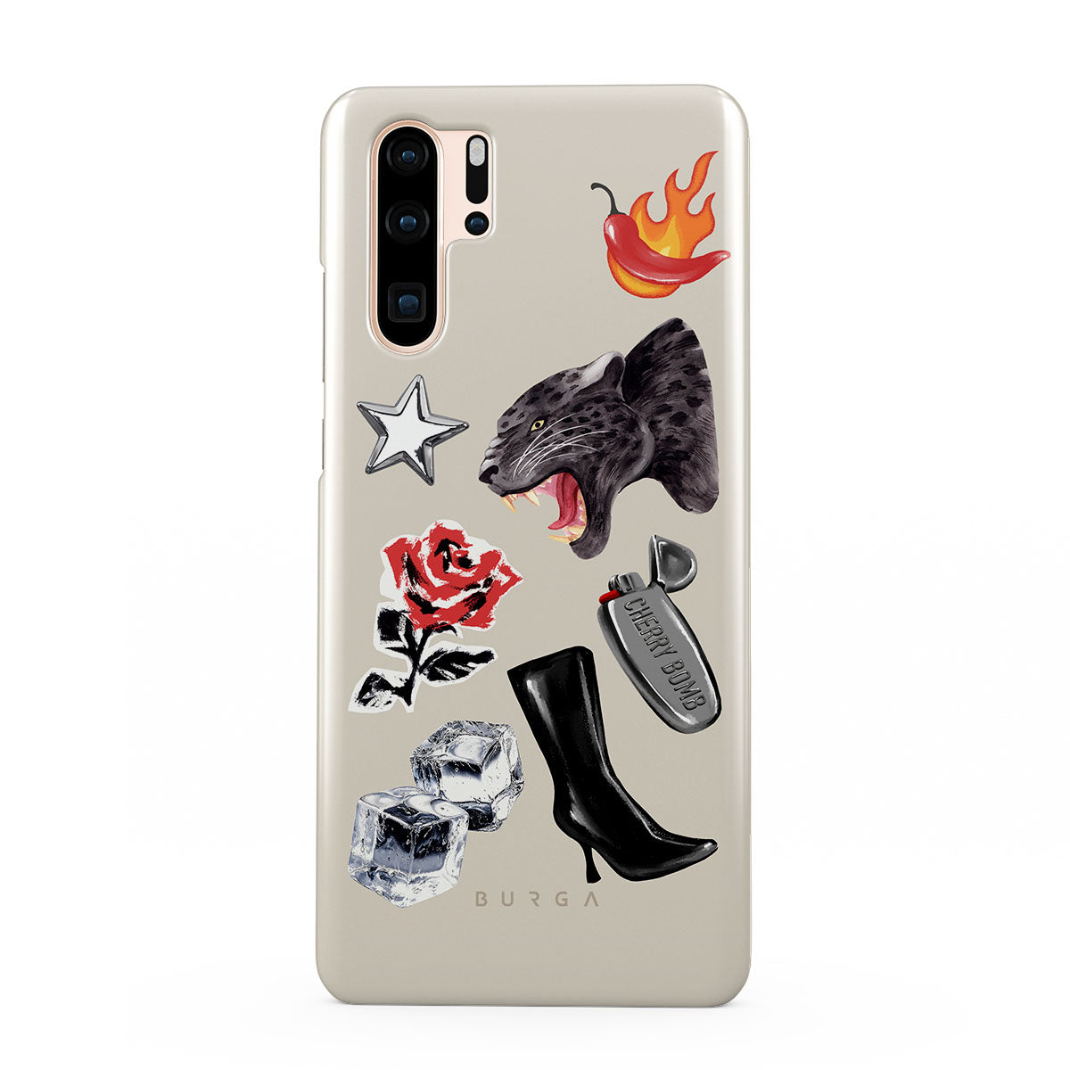 Kenmerken van dit design: zwarte panter, rode roos, brandende paprika, zilveren aansteker, zwarte knielaarzen, ijsblokjes, zilveren ster.