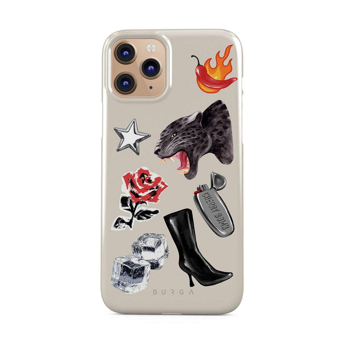 Kenmerken van dit design: zwarte panter, rode roos, brandende paprika, zilveren aansteker, zwarte knielaarzen, ijsblokjes, zilveren ster.