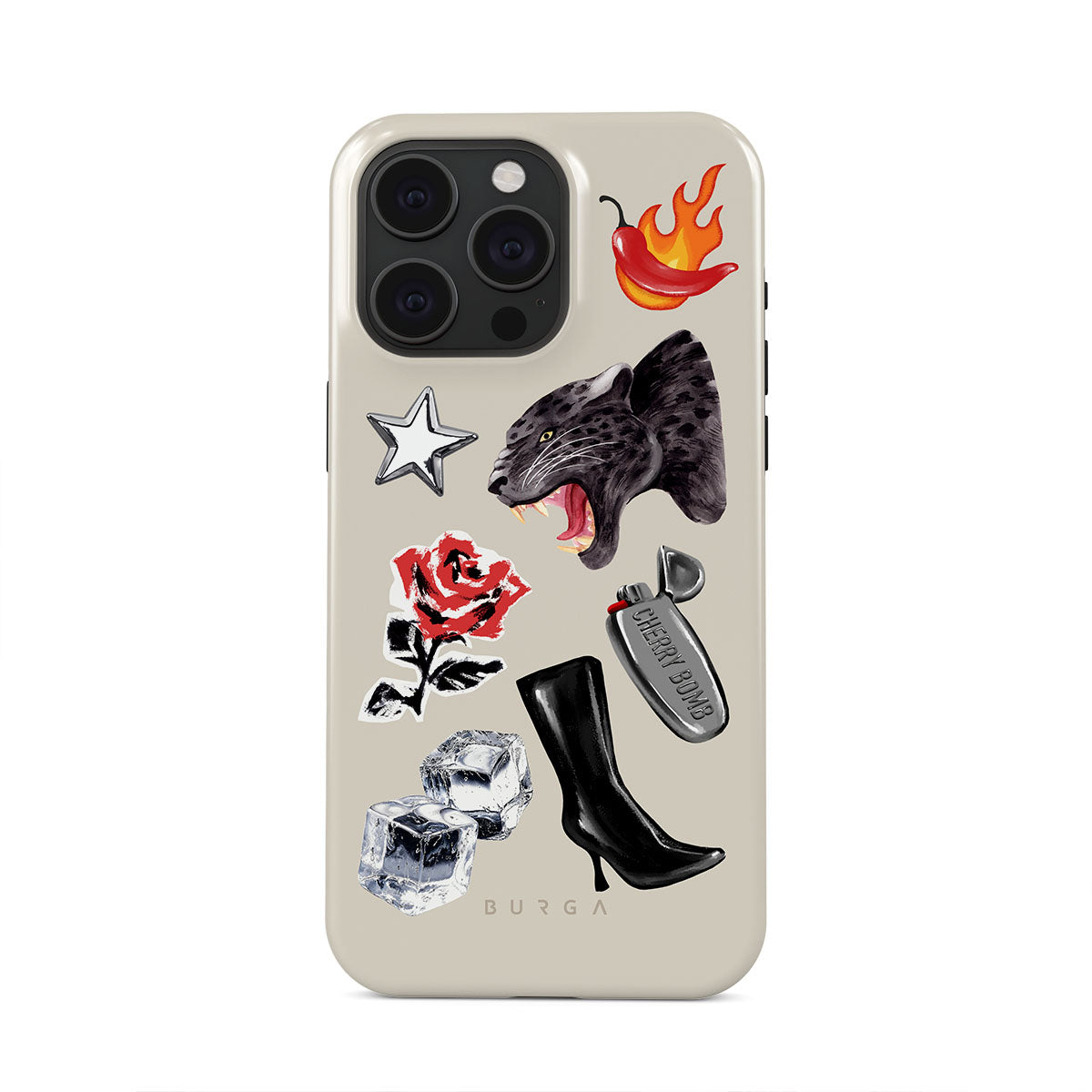 Kenmerken van dit design: zwarte panter, rode roos, brandende paprika, zilveren aansteker, zwarte knielaarzen, ijsblokjes, zilveren ster.