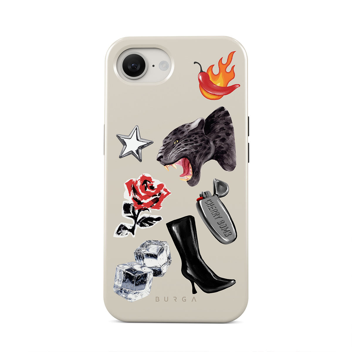 Kenmerken van dit design: zwarte panter, rode roos, brandende paprika, zilveren aansteker, zwarte knielaarzen, ijsblokjes, zilveren ster.