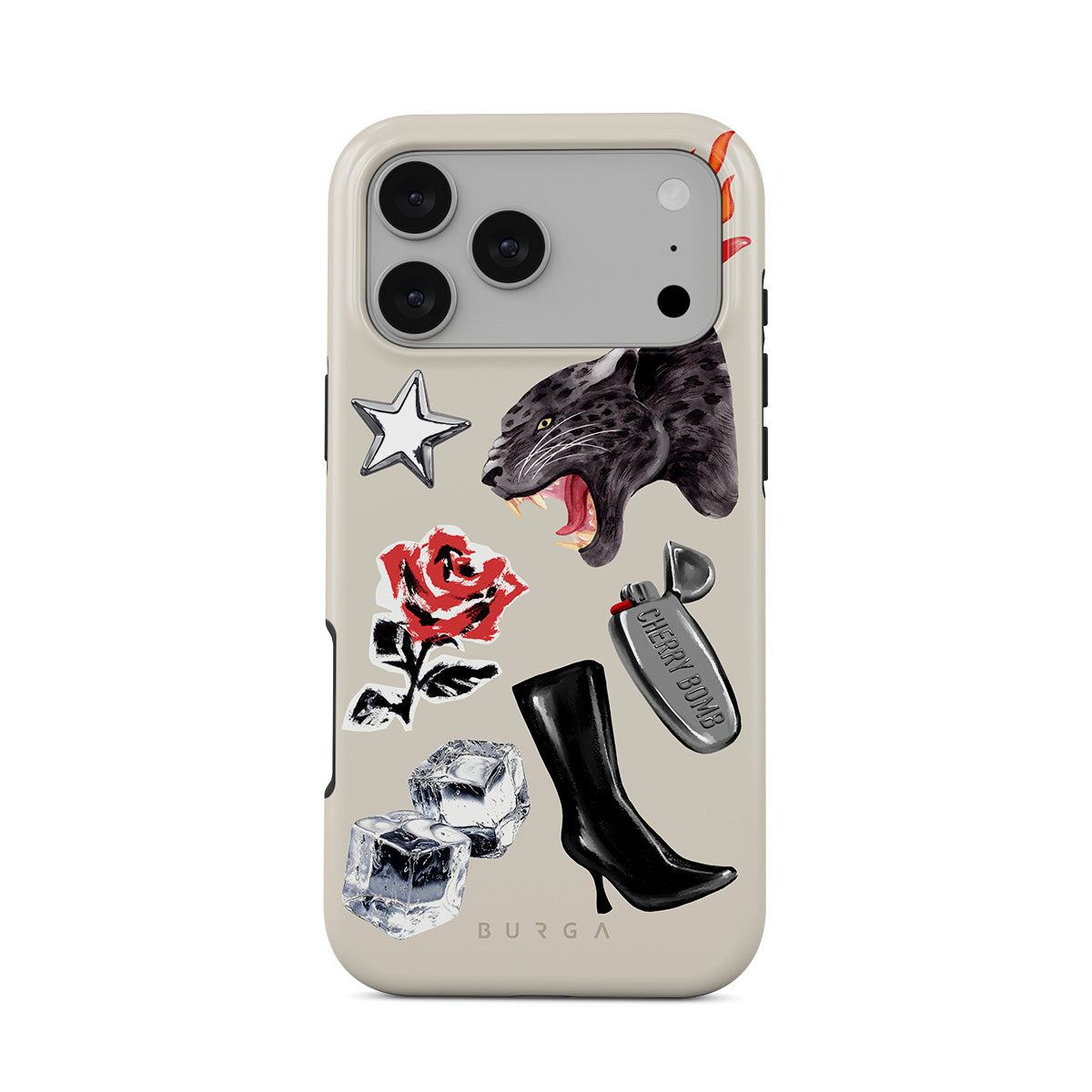 Kenmerken van dit design: zwarte panter, rode roos, brandende paprika, zilveren aansteker, zwarte knielaarzen, ijsblokjes, zilveren ster.