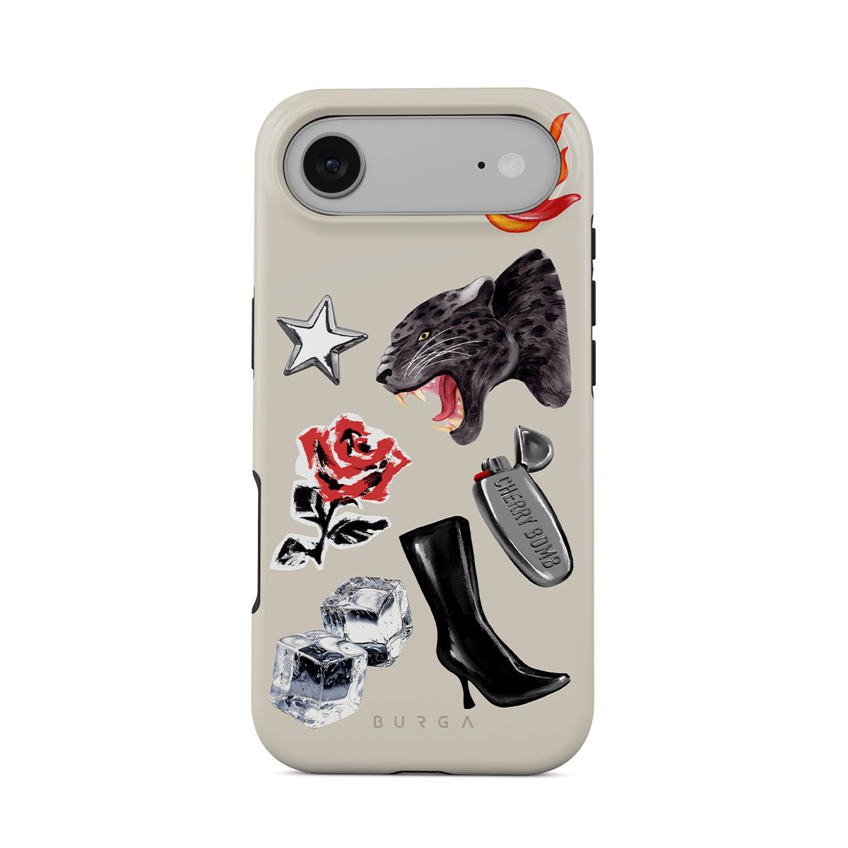 Kenmerken van dit design: zwarte panter, rode roos, brandende paprika, zilveren aansteker, zwarte knielaarzen, ijsblokjes, zilveren ster.