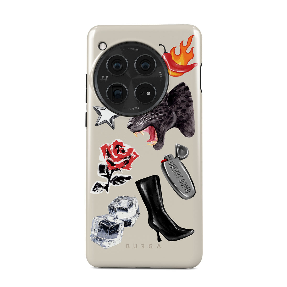 Kenmerken van dit design: zwarte panter, rode roos, brandende paprika, zilveren aansteker, zwarte knielaarzen, ijsblokjes, zilveren ster.