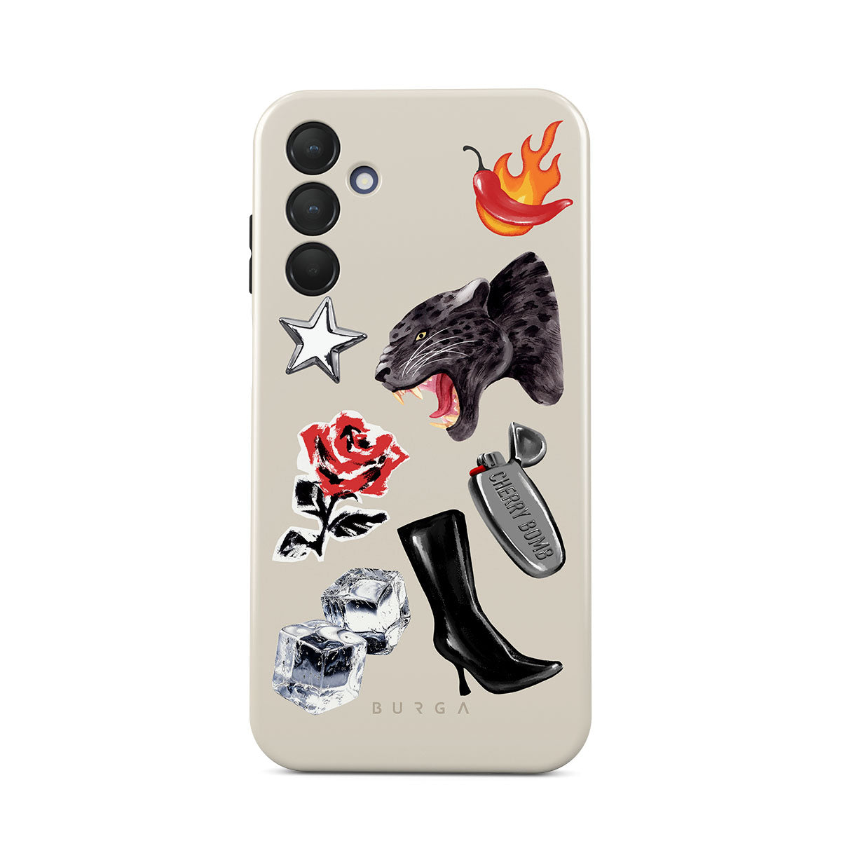 Kenmerken van dit design: zwarte panter, rode roos, brandende paprika, zilveren aansteker, zwarte knielaarzen, ijsblokjes, zilveren ster.