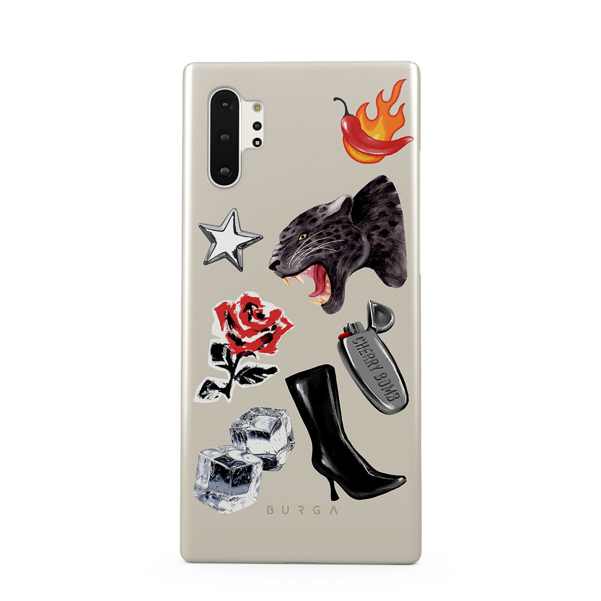 Kenmerken van dit design: zwarte panter, rode roos, brandende paprika, zilveren aansteker, zwarte knielaarzen, ijsblokjes, zilveren ster.