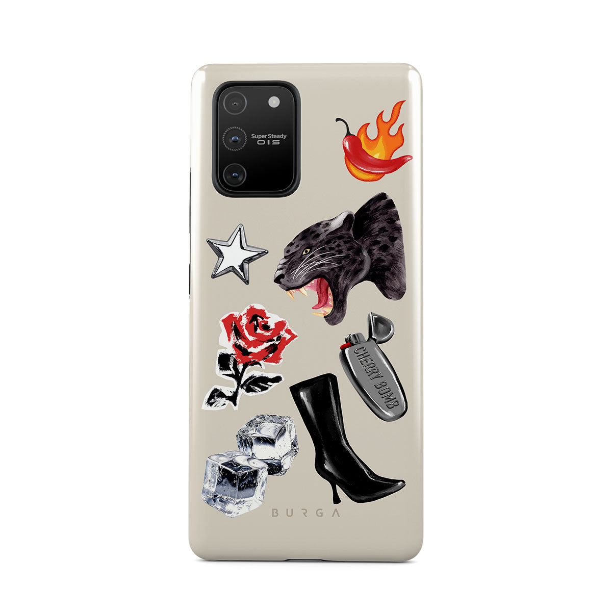 Kenmerken van dit design: zwarte panter, rode roos, brandende paprika, zilveren aansteker, zwarte knielaarzen, ijsblokjes, zilveren ster.
