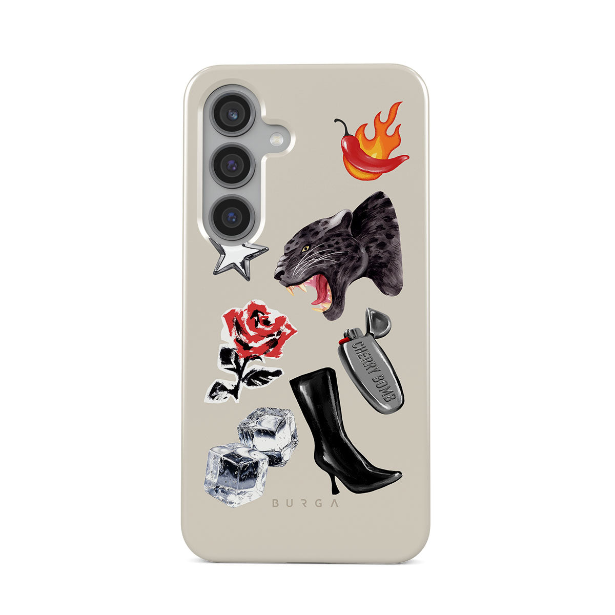 Kenmerken van dit design: zwarte panter, rode roos, brandende paprika, zilveren aansteker, zwarte knielaarzen, ijsblokjes, zilveren ster.