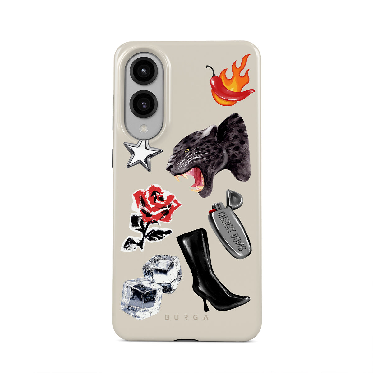 Kenmerken van dit design: zwarte panter, rode roos, brandende paprika, zilveren aansteker, zwarte knielaarzen, ijsblokjes, zilveren ster.