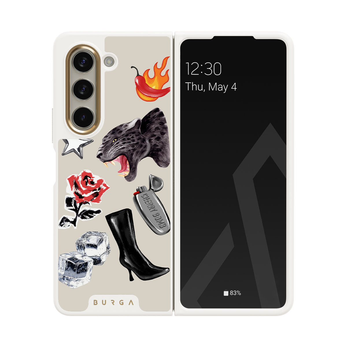 Kenmerken van dit design: zwarte panter, rode roos, brandende paprika, zilveren aansteker, zwarte knielaarzen, ijsblokjes, zilveren ster.